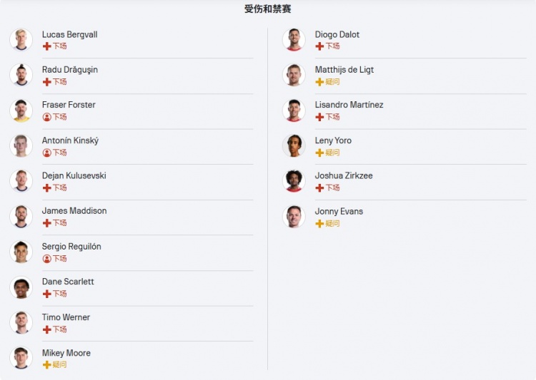 赛前,两队也都遭遇到了比较严重的伤势困扰,热刺方面机会制造者库卢赛夫斯基及麦迪逊确定无缘出战,曼联的达洛特、利桑德罗伤缺,德里赫特、约罗则是在观察的状态,整条后防伤了一半,阿莫林压力很大。